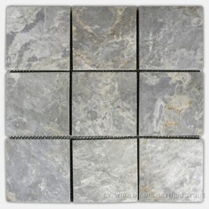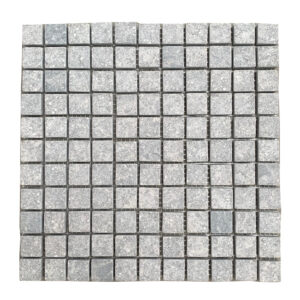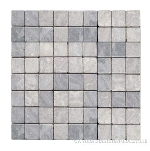 Subtle light grey stone mosaics in square design, sizes 3×3 and 10×10 cm. Mounted on 30×30 cm sheets for seamless installation. Available in natural, tumbled, and polished finishes.